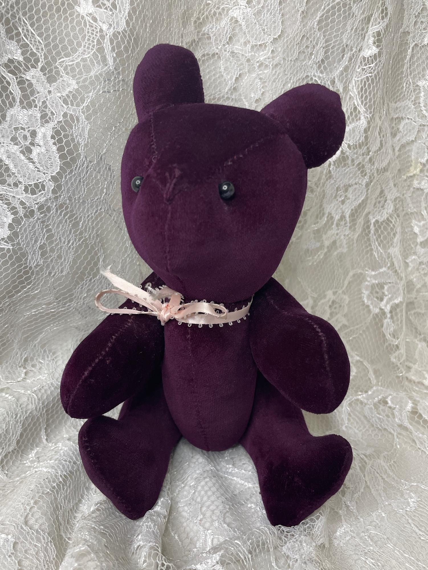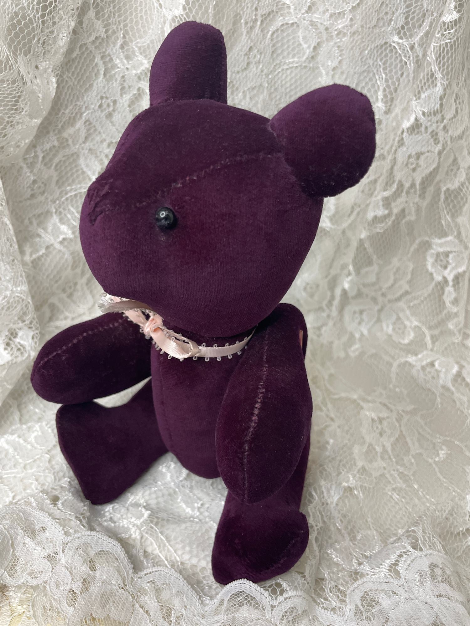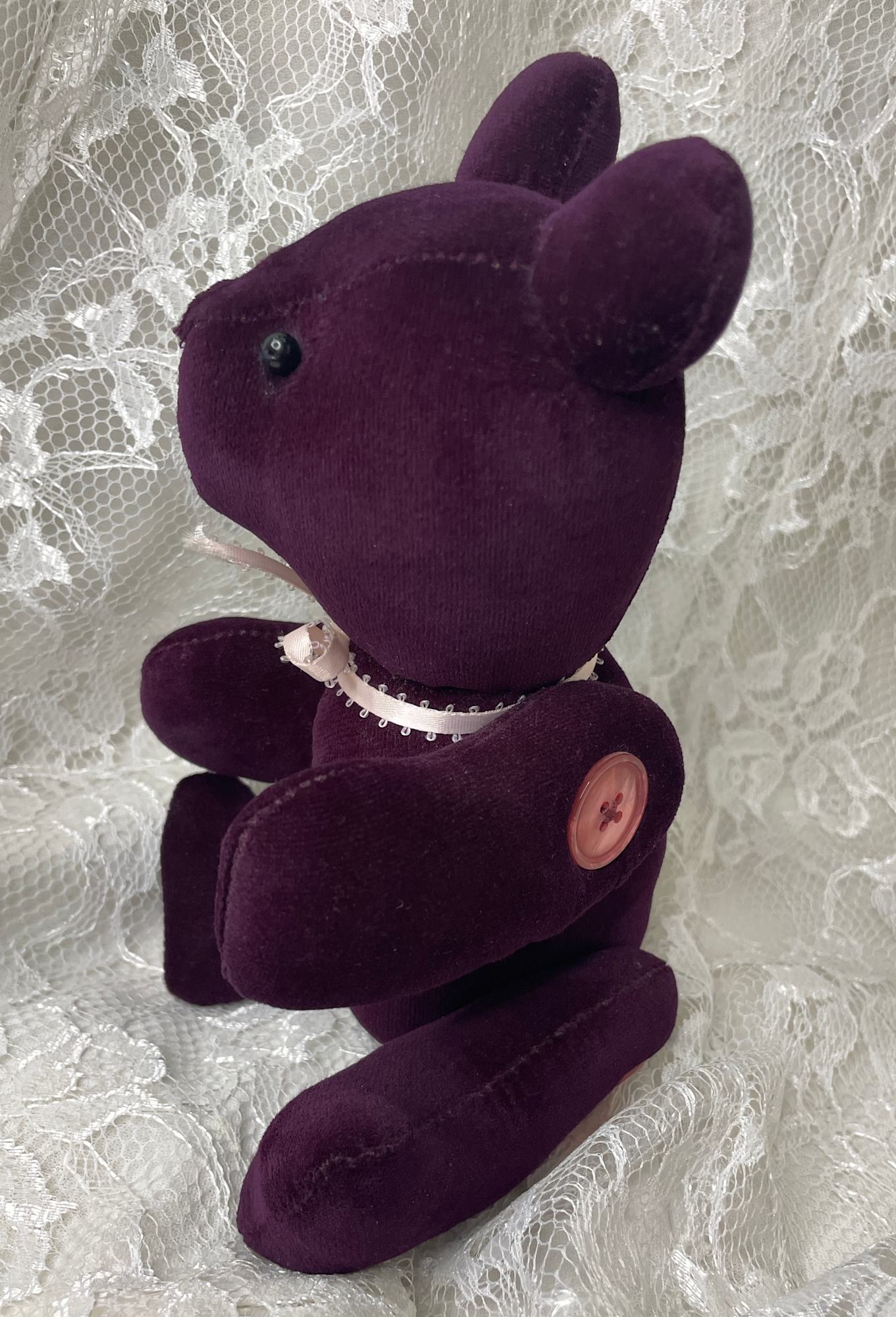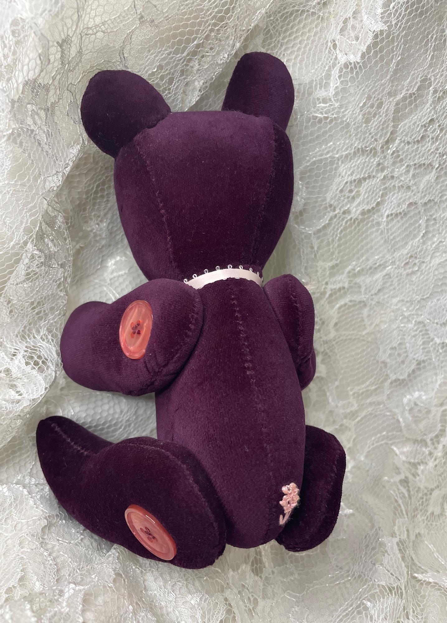 Medium, red velveteen bear, button jointed limbs, sachet, rose, pink bow