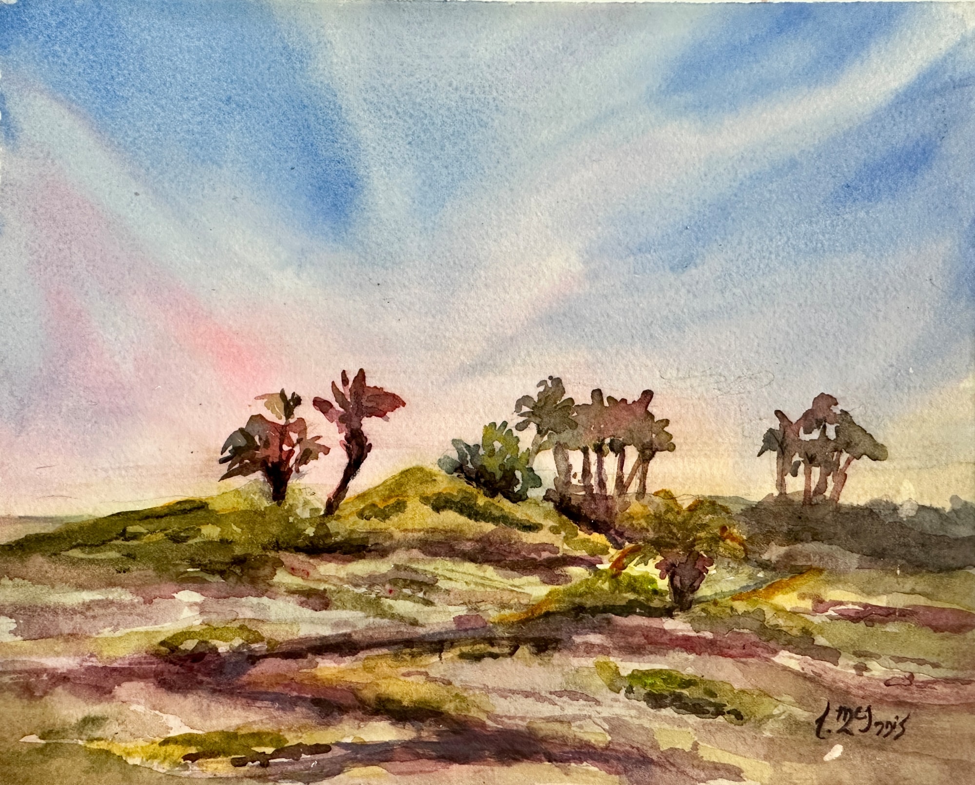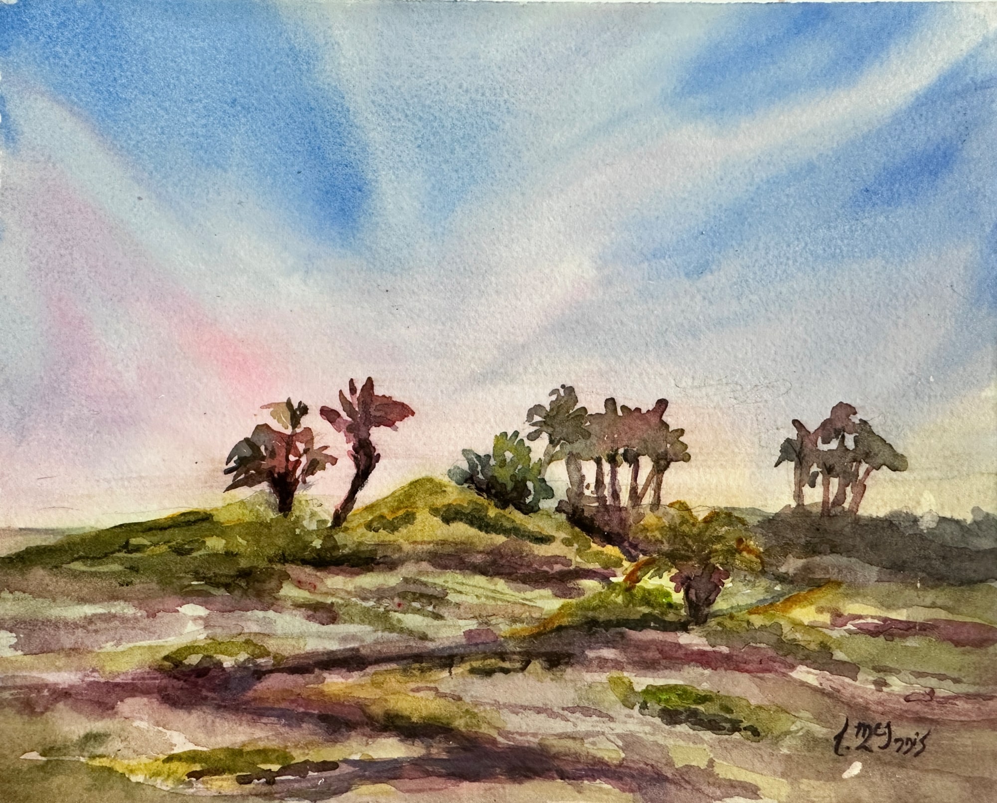 "View from the Pavilion" is a captivating plein air watercolor painting measuring 8x10, which unveils a breathtaking scene from St. George Island. In this artwork, the artist's easel is set up at the pavilion, capturing a stunning view of the glorious late afternoon sky. With delicate brushstrokes and a vibrant color palette, the artist skillfully depicts the captivating sight of rays of sunlight piercing through the clouds, creating a celestial spectacle.