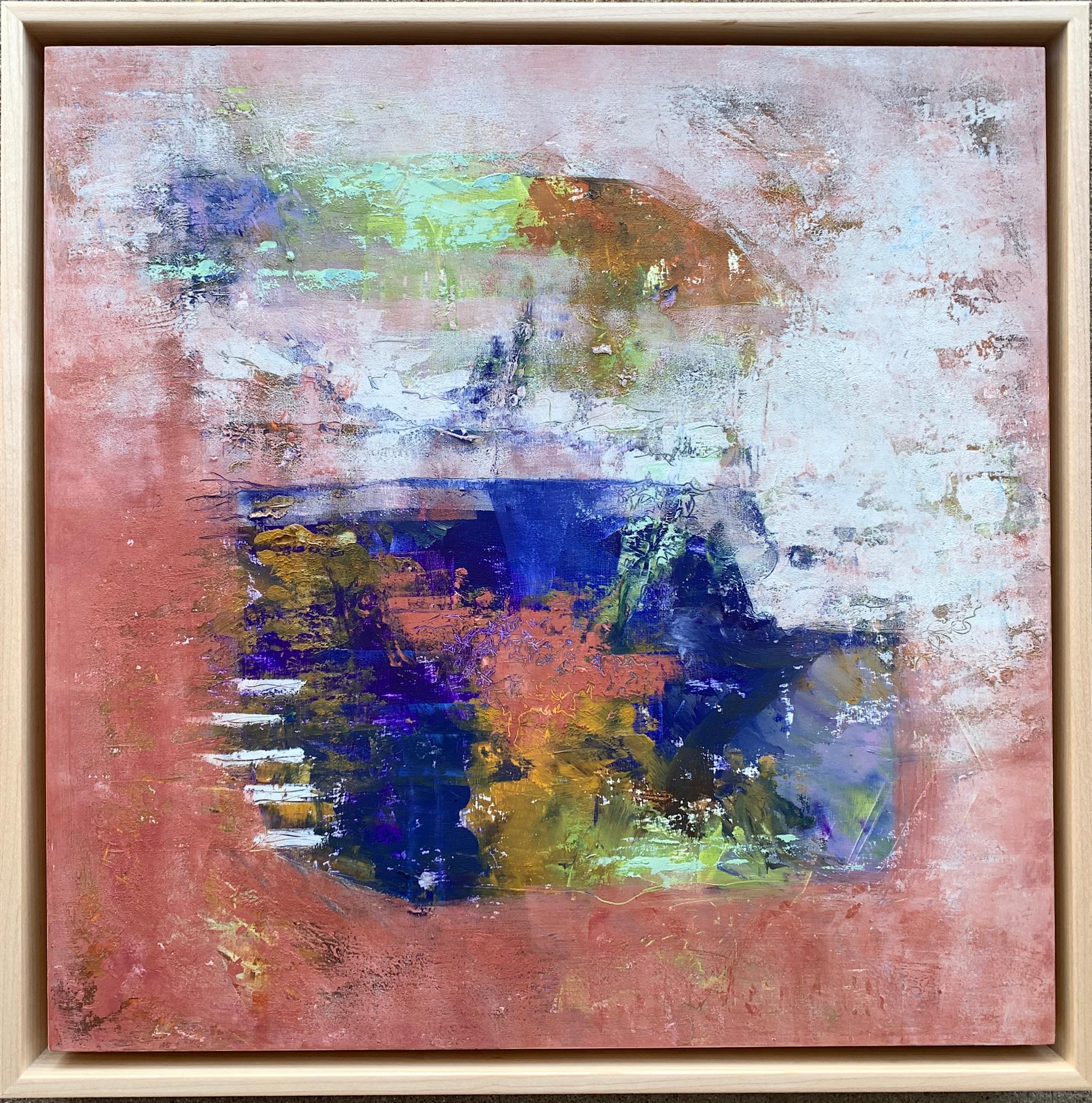 14 x 14 x 1 1/2 abstract oil/coldwax/ mixed medium on cradled wood panel. Mounted into natural wood float frame.