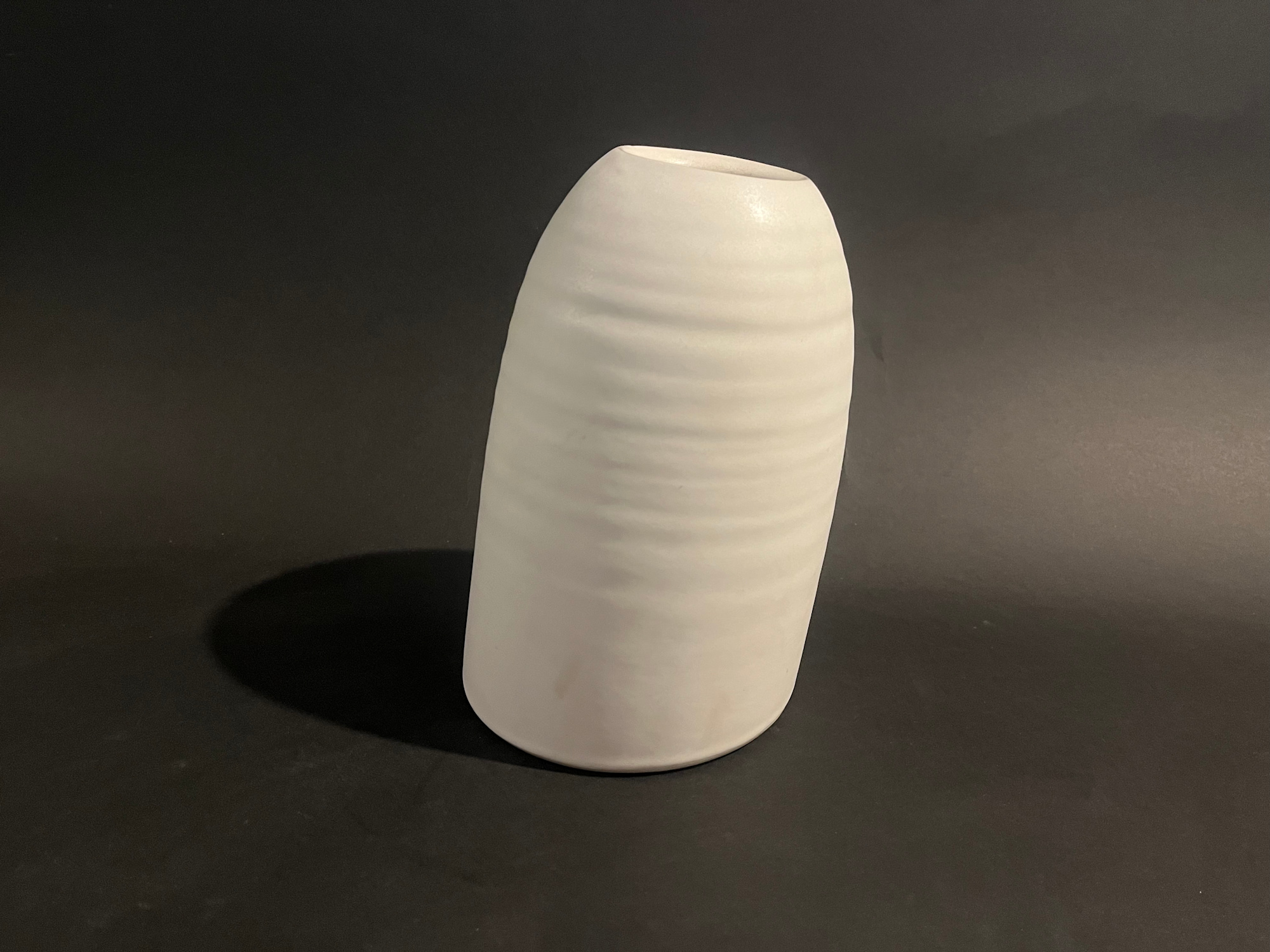 Cylindrical white unglazed ceramic ikebana vase, slightly tilted.