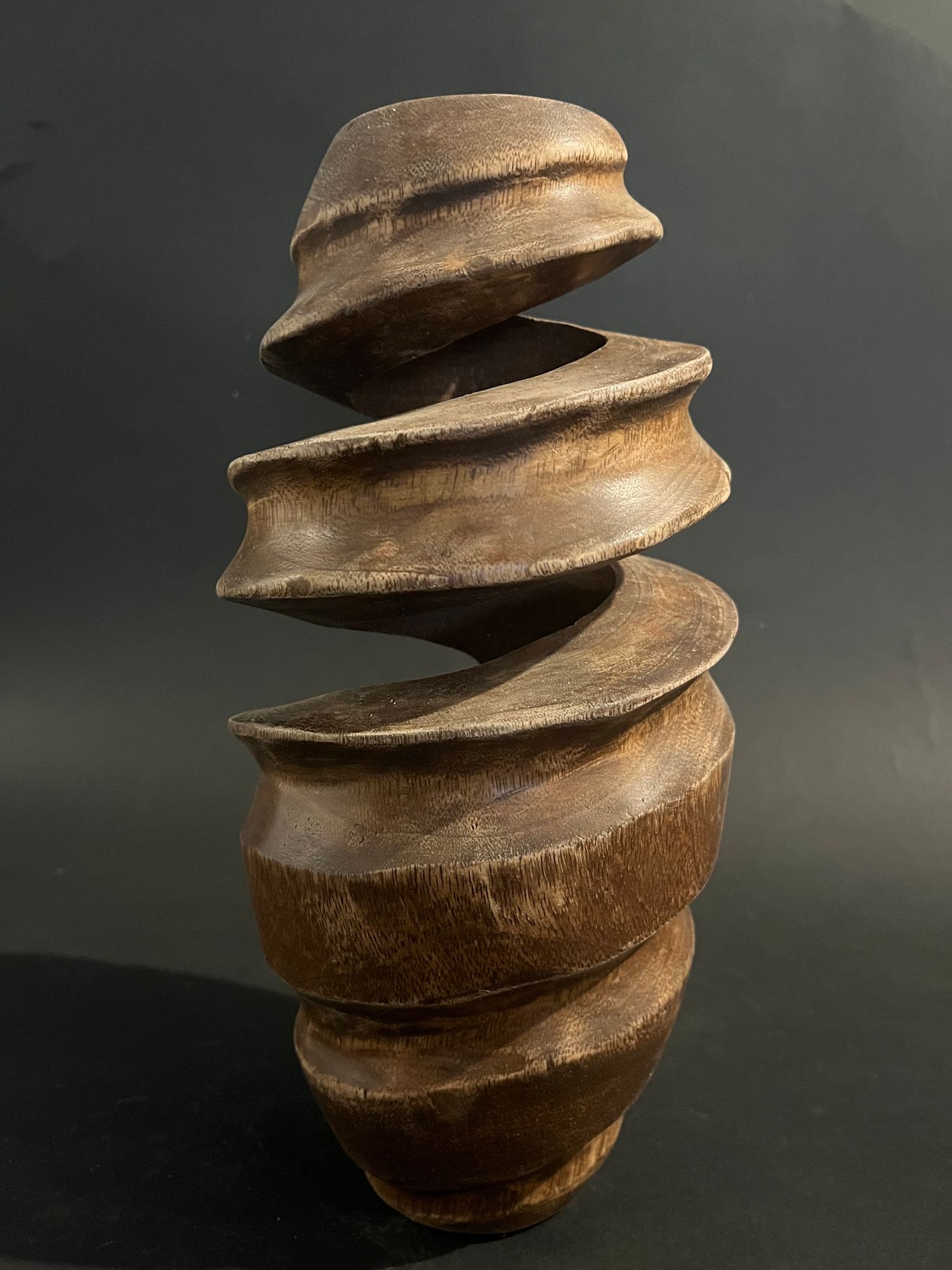 Ovoidal wooden ikebana vase, carved in a spiral form with occasional openings in the wood.