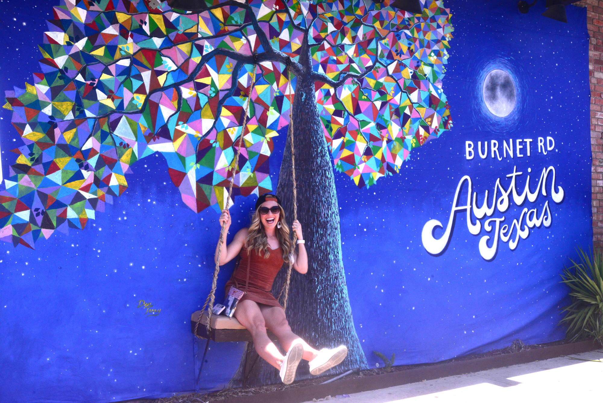 This large canvas exterior mural with it's colorful prismatic tree has a three dimensional swing for selfies capable of supporting up to about 300 lbs. This type of mural incorporates Terry's long experience in stage and film set design and construction. It's located in North Austin on Burnett Road at Woodrows Bar & Lounge.